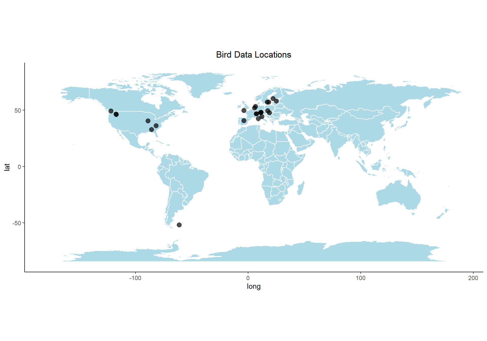 # World map coordinatesworld_coordinates <-map_data("world")# Remove rows with missing coordinatesbirds_map_unique <-subset(birds_map_unique,!is.na(Long_study_area) &!is.na(Lat_study_area))# Create world map using geom_polygonfig_map <-ggplot() +geom_polygon(data = world_coordinates,aes(x = long, y = lat, group = group),color ="white", fill ="lightblue" ) +geom_point(data = birds_map_unique,aes(x = Long_study_area, y = Lat_study_area),color ="black", alpha =0.7,size =3 ) +coord_quickmap() +# correct aspect ratiotheme_classic() +labs(title ="Bird Data Locations") +theme(legend.position ="none",plot.title =element_text(hjust =0.5) )fig_map